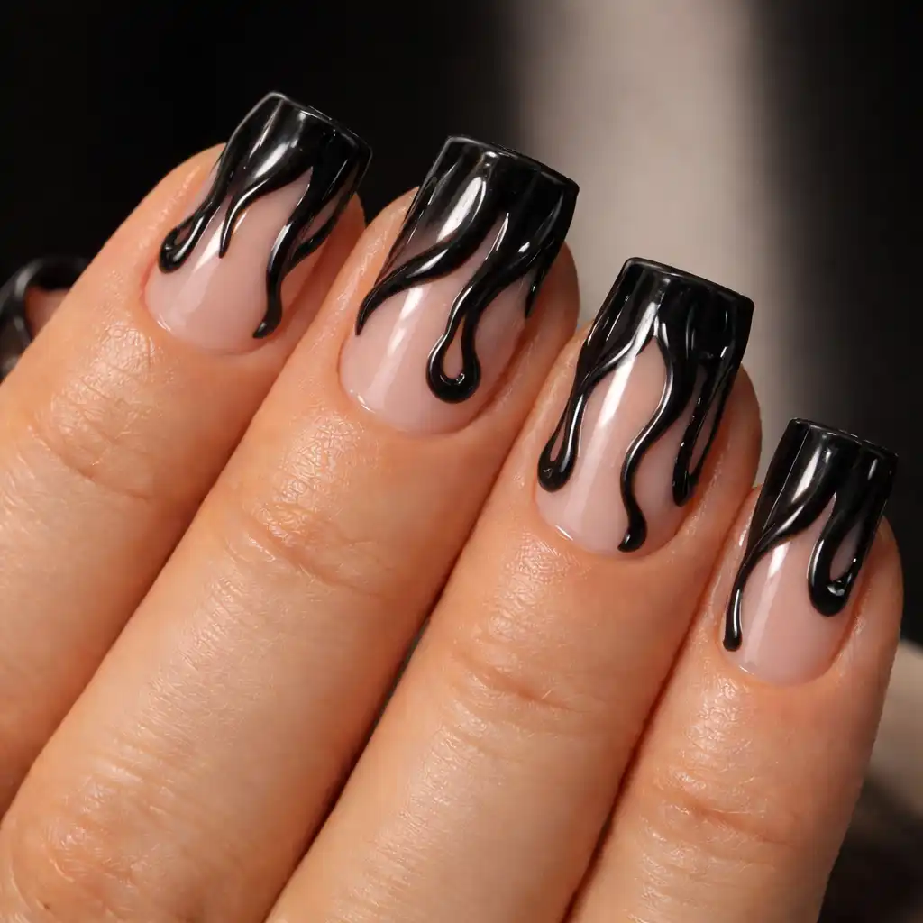 Thick black gel creates bold, abstract 3D forms on a square nail, edgy art piece.