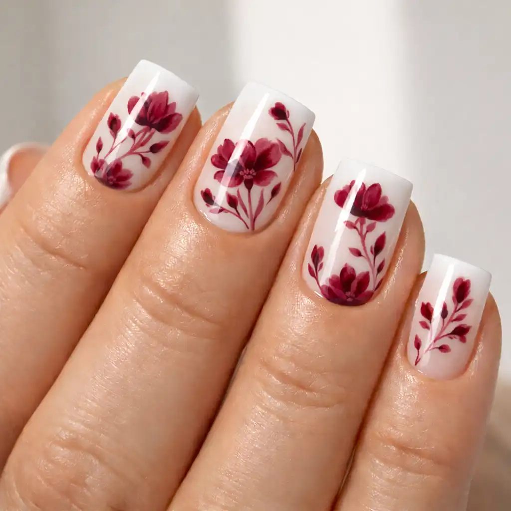 Milky base with warm burgundy floral accents, subtle yet artistic.