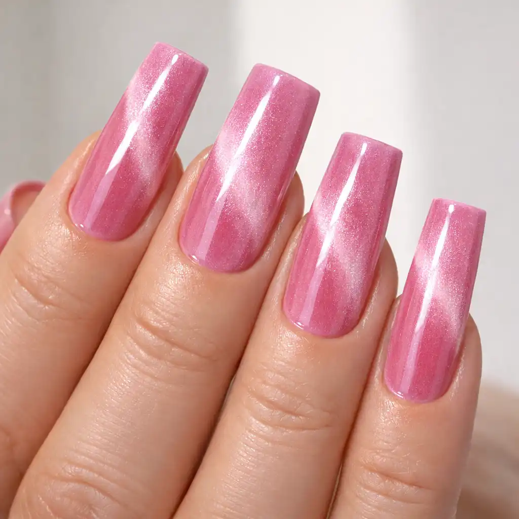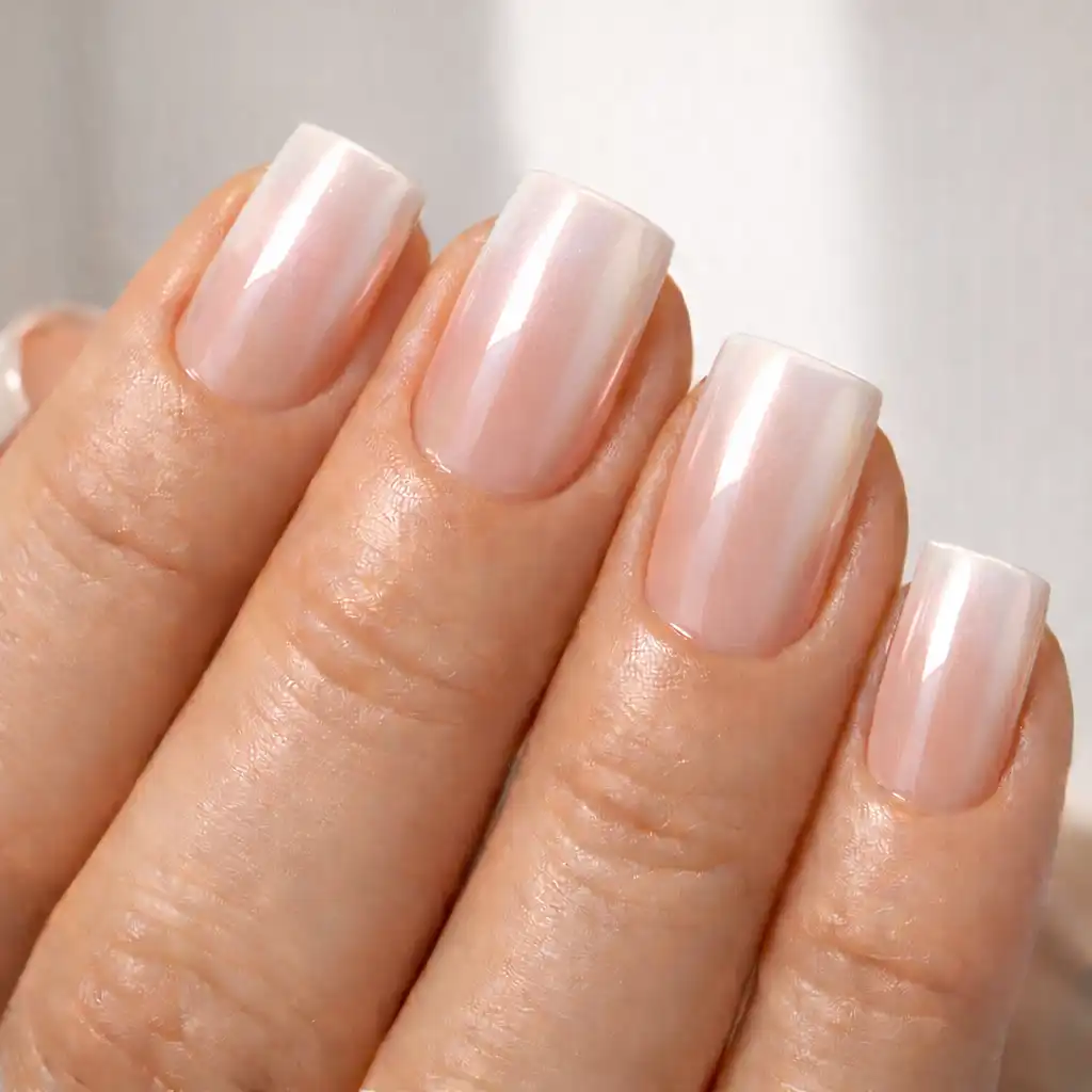 A sheer nude or milky pink base layered with fine chrome powder creates that viral glazed finish. On a square shape, the reflective surface looks extra sharp and polished. This style works for weddings, office wear, and everyday minimal glam. The flat tip enhances the reflective shine and gives a crisp, editorial look.