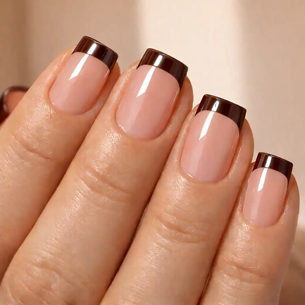 Deep brown glossy French tips add sophistication, great for autumn or everyday luxe.