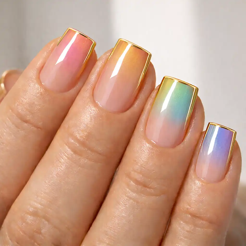Colorful ombré French tips outlined with fine gold chrome, vibrant yet refined.