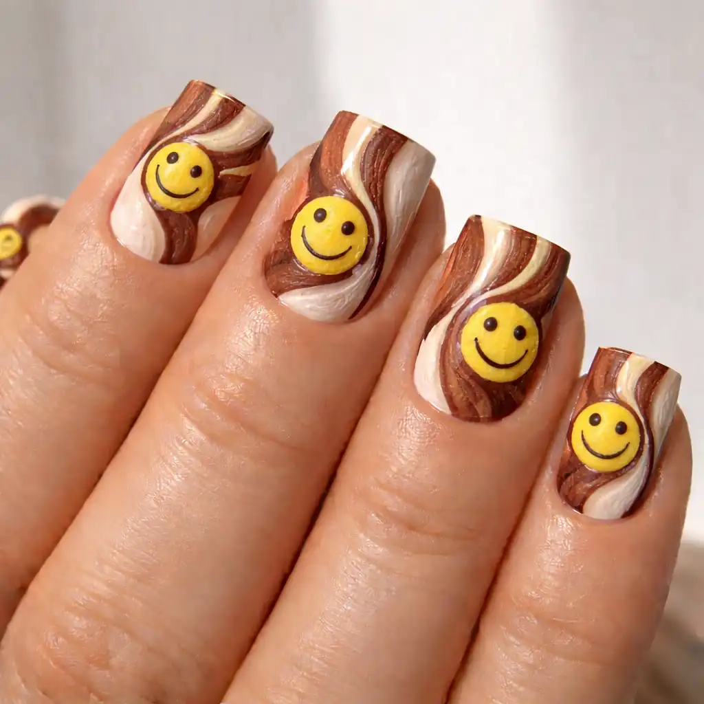 Earthy browns and creams with swirls and smiley faces, retro yet trendy.