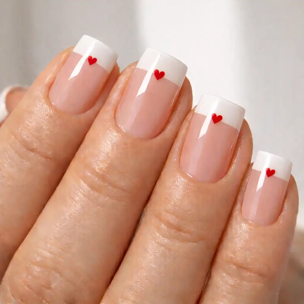 French tips enhanced with delicate red heart accents, sweet and flirty.