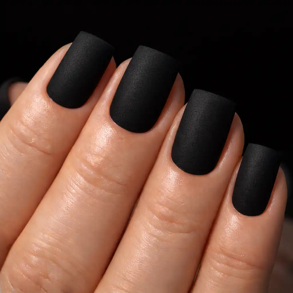 Pure matte black on a short square shape is bold, clean, and powerful. No art needed. The squared edge gives it a modern, fashion forward vibe.
