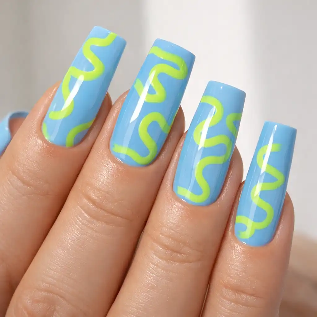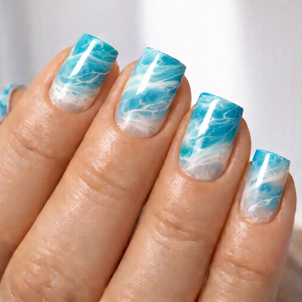Swirls of turquoise, white, and deep blue blended like ocean waves. The square shape makes the marble pattern look structured rather than messy. These are best for Summer vacations, beach aesthetics, tropical content shoots.