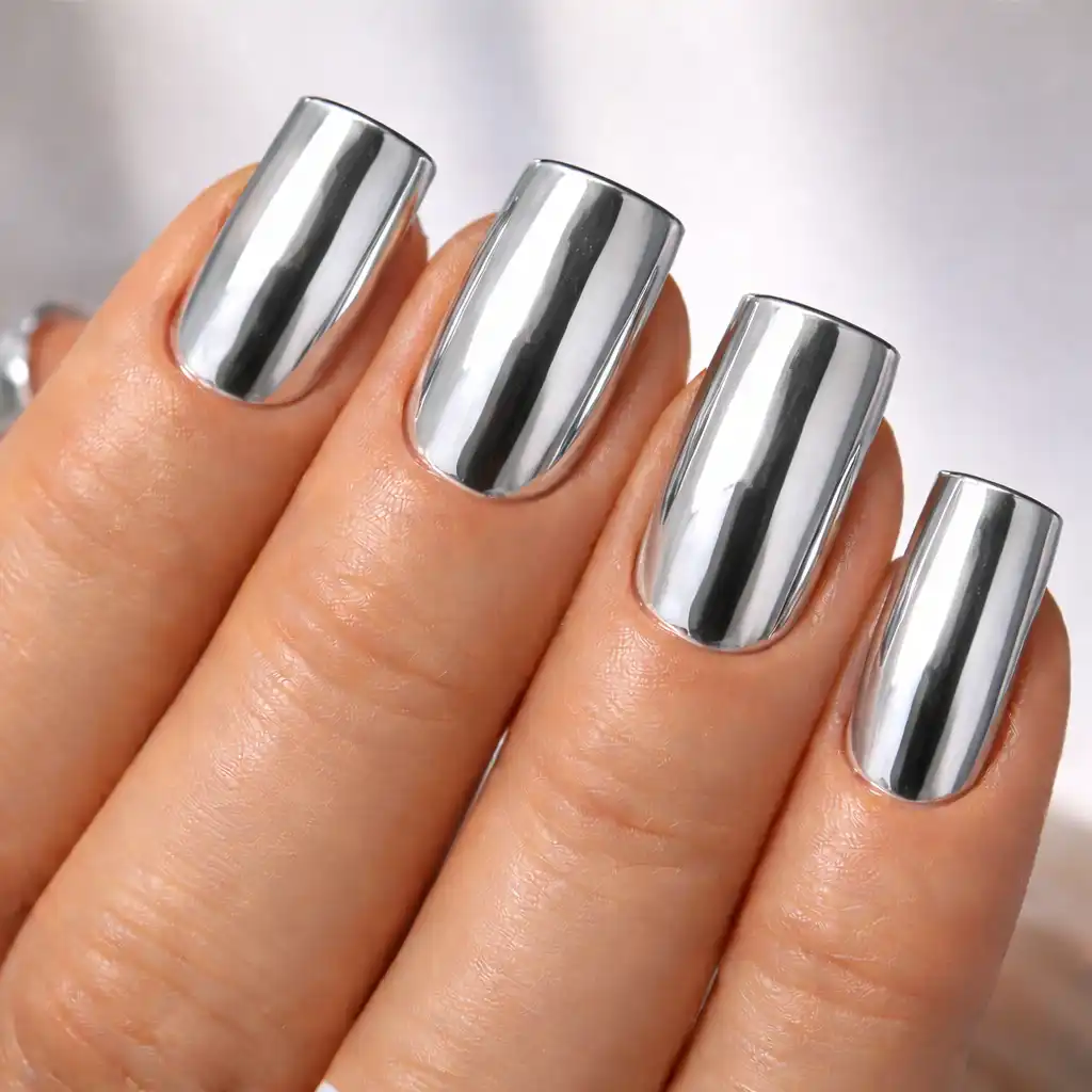 Full mirror chrome on long square nails. Sleek, futuristic, and attention grabbing. The flat edge enhances the mirror reflection and gives runway energy.