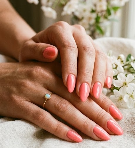 Coral blush nails are the perfect mix of pink and orange, creating a warm and lively shade that feels fresh for spring. This color adds a subtle brightness to your manicure without being too bold, making it ideal for both casual and dressy looks.