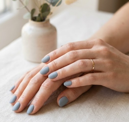 Fog blue nails are a more muted and sophisticated take on traditional blue shades. With a subtle gray undertone, this color feels calm, elegant, and slightly moody which is perfect for those who prefer understated beauty.