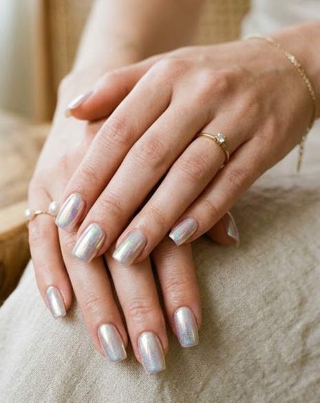 Rather than relying on bold color, this trend focuses on texture and light. It’s perfect for those who want a modern, high-fashion manicure that still feels soft and wearable. The glossy, almost mirror-like finish adds dimension and sophistication making it ideal for special occasions or everyday glam