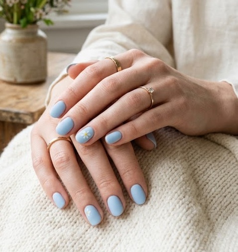 Powdery sky blue captures the essence of clear spring days, making it one of the most calming and refreshing nail colors this season. Unlike bright blues, this shade has a soft, slightly dusty undertone that makes it feel more wearable and sophisticated.