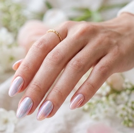Iridescent glass nails are one of the most futuristic and elegant trends of Spring 2026. This look features a sheer or translucent base with a reflective, pearl-like shimmer that changes subtly in different lighting.