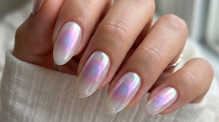 Chrome aura nails combine two viral trends, aura gradients and glazed chrome finishes. After creating the soft aura base, a chrome powder is applied to give a reflective, glass like shine. The result is luminous and futuristic, shifting in light with a pearly glow. This style is especially popular for high-fashion looks and social media aesthetics.