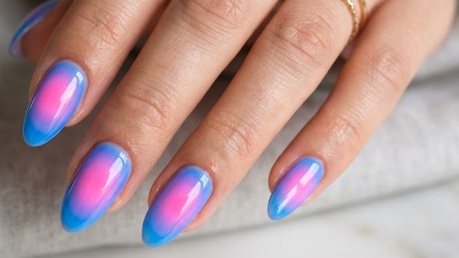 Aura nails are all about soft, diffused color radiating from the center of the nail creating a glowing, airbrushed effect that feels both modern and mystical.