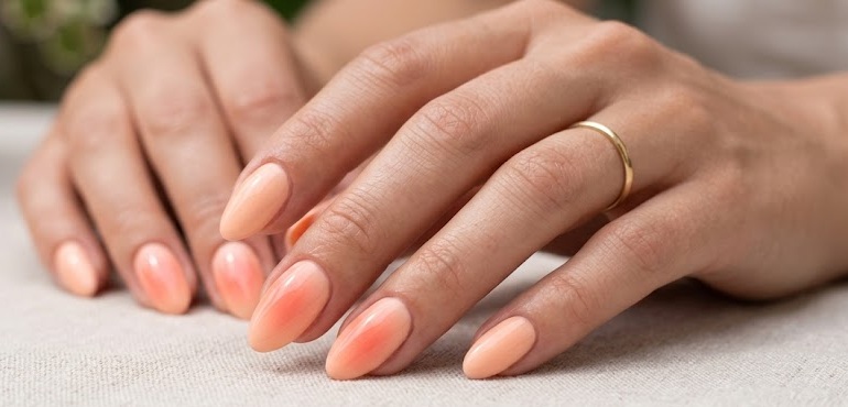 Peach aura nails offer a warm, sun kissed glow that feels fresh and youthful. The soft coral tones blend beautifully into a nude base, making it perfect for summer days or natural glam looks.