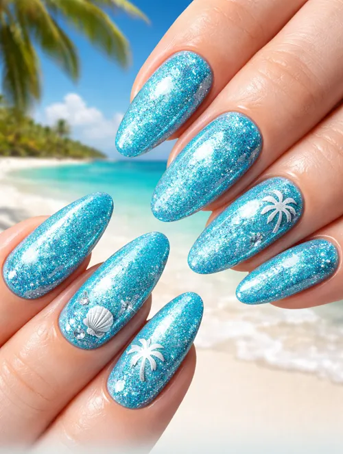 Aquamarine nails are inspired by the sparkling blue-green color of tropical water. This design often includes glitter, chrome, or glossy finishes that mimic sunlight reflecting on the ocean. Aquamarine shades are especially popular during warm months because they give a vibrant, beach-ready aesthetic and look stunning against tanned skin.