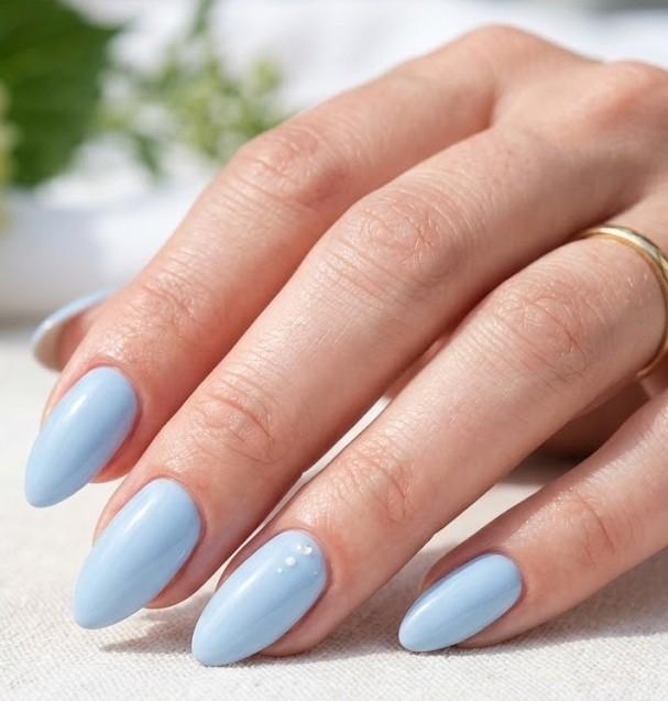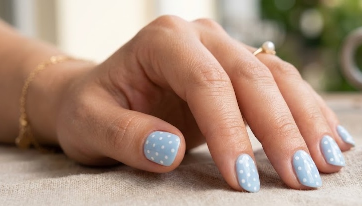 Polka dot nails are a retro yet playful manicure style. This design typically features a light blue base with evenly spaced white or darker blue dots. The pattern creates a cheerful and youthful look that is perfect for casual summer outfits. Polka dots also work beautifully on short nails, making this manicure both trendy and practical.