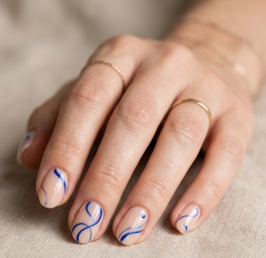 Abstract nail designs transform nails into miniature canvases. In this style, thin blue lines, geometric shapes, and irregular patterns are painted over a nude or milky base. The result is a modern, editorial manicure that feels both minimalist and creative. Abstract nails are trending because they allow endless customization and unique artistic expression.