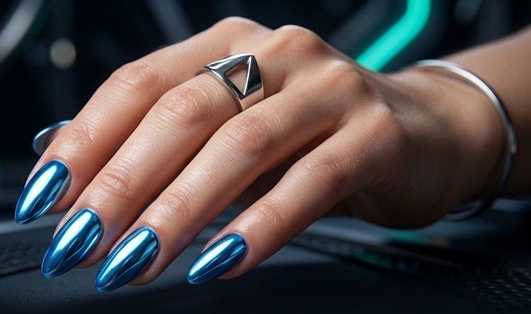 Blue chrome nails deliver a bold, futuristic vibe thanks to their reflective metallic finish. This design uses chrome powder or metallic polish layered over blue nail polish to create a mirror-like shine. Chrome manicures are highly customizable and can range from subtle pearlescent baby blue to dramatic electric blue tones. The reflective finish catches the light beautifully, making it perfect for summer parties and nightlife looks.