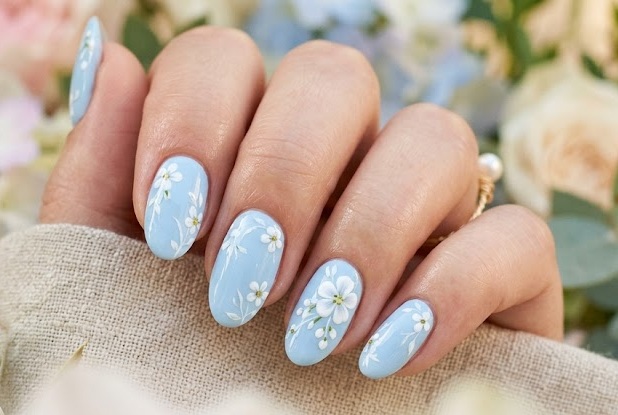 Blue floral nails combine soft blue shades with delicate flower designs for a feminine summer manicure. Tiny white or pastel flowers are painted over a light blue base, creating a romantic and fresh look. This style works beautifully on short or medium nails and is ideal for spring and summer occasions such as vacations, weddings, or garden parties.