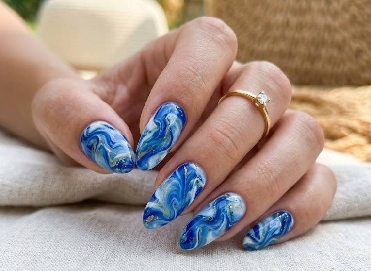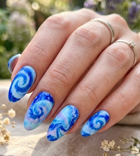 Blue marble nails feature a swirling pattern that resembles natural stone or flowing water. The design is created by blending multiple shades of blue with white to form unique marble patterns. Each nail looks slightly different, giving the manicure an artistic and luxurious appearance.