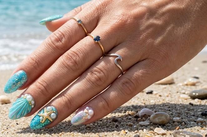 Mermaid nails are a fun, beach inspired manicure that perfectly matches summer aesthetics. The design often includes seashell textures, pearl accents, or iridescent blue polish that mimics shimmering ocean water. Some versions use 3D gel to create shell shapes or water droplets, giving the manicure a magical underwater look.