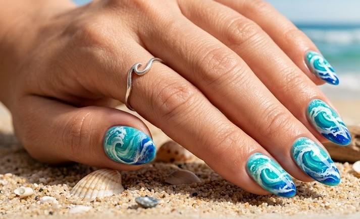 Ocean wave nails are inspired by the movement and colors of the sea. The design usually combines turquoise, sky blue, and white swirls to mimic ocean waves flowing across the nails. Some variations include shimmer or chrome accents to create a reflective water effect.