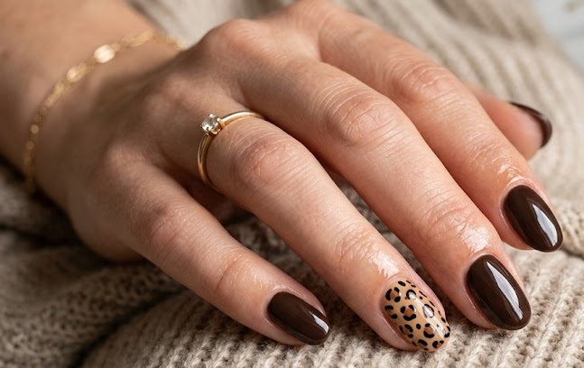 Brown animal print nails add a bold and playful element to your manicure. Popular patterns include leopard spots, cow prints, or cheetah designs in brown tones. These prints are often used as accent nails combined with solid brown shades for balance. The contrast between patterns and plain nails creates a dynamic look.