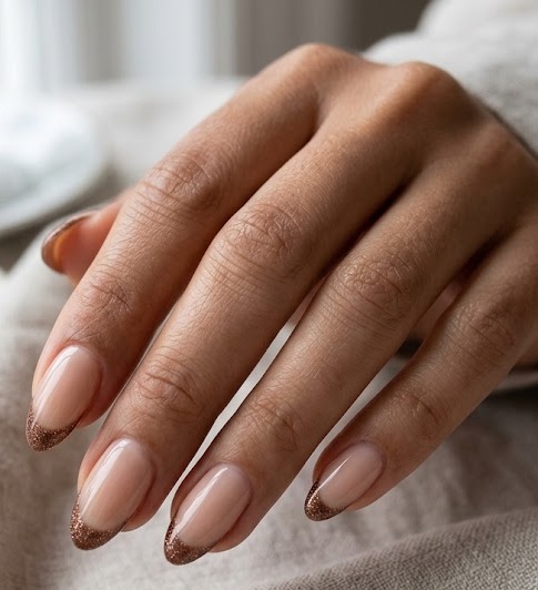 This design combines the elegance of French tips with the sparkle of glitter. Instead of plain brown tips, glitter-infused brown polish is used for a shimmering effect. The nude base keeps the look balanced and clean. It’s perfect for those who want a subtle yet festive manicure. The sparkle adds just enough glamour without being overwhelming. This style works well for weddings, parties, or celebrations. It’s a beautiful mix of classic and modern aesthetics. The result is chic, refined and slightly playful.