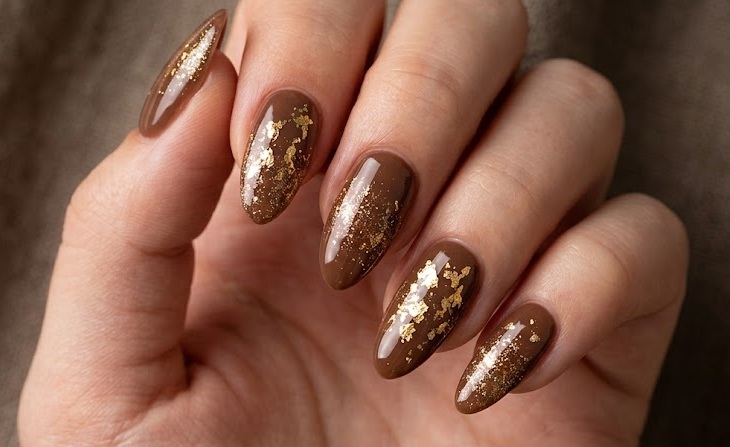 Brown and gold foil nails combine earthy tones with metallic luxury. Gold foil pieces are applied randomly over a brown base, creating a textured and artistic look. The irregular placement of foil makes each nail unique. This design is perfect for special occasions or when you want something eye-catching. The contrast between matte brown and shiny gold adds depth. It pairs beautifully with jewelry and evening outfits. This style feels rich, elegant, and slightly dramatic. It’s a great way to elevate a simple brown manicure.