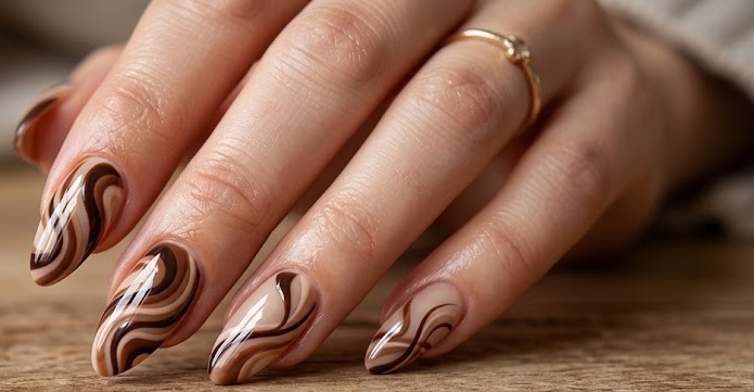 Brown swirl nail art features curved lines in different shades of brown, creating a flowing and abstract pattern. This design is inspired by retro aesthetics but updated with modern color palettes. The swirls can be subtle or bold depending on the contrast between shades. It adds movement and creativity without overwhelming the overall look.