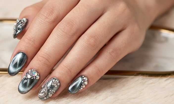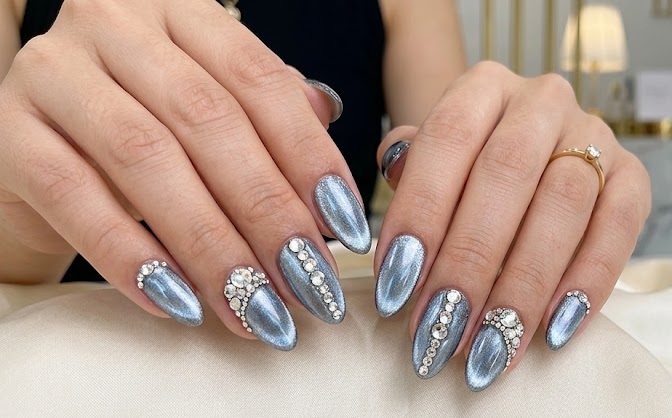 This high-fashion design combines cat eye chrome with 3D elements like rhinestones, beads, or textures. The layered look enhances depth and gives a luxurious, editorial finish.