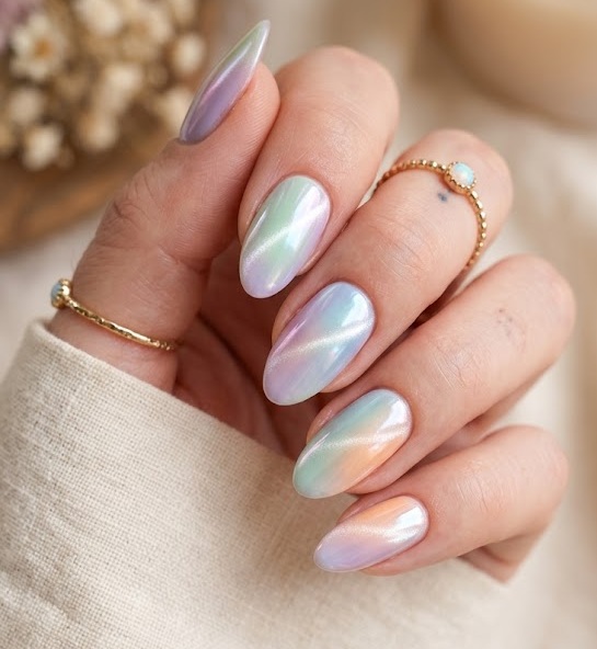 Aura nails meet cat eye chrome in this dreamy design. Soft gradients blend with magnetic shimmer to create a glowing aura effect that looks ethereal and trendy.