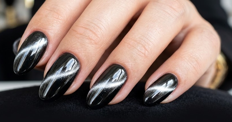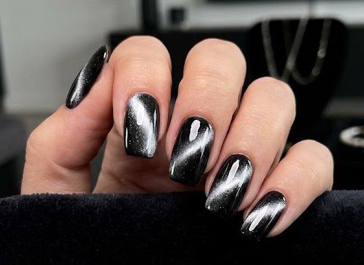 Black & Silver Cat Eye Chrome Nails