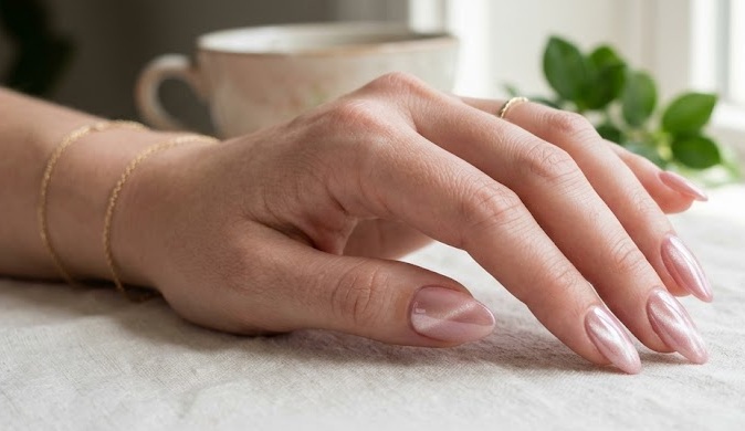 Soft blush tones paired with chrome create a romantic and feminine manicure. The subtle magnetic shimmer gives a “lit-from-within” glow, making it perfect for everyday elegance.