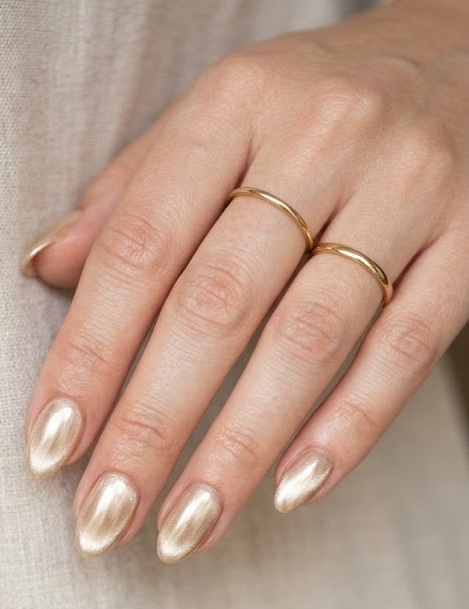 A softer take on metallic nails, this design uses champagne gold chrome with a subtle cat eye shimmer. The finish is refined and understated, offering just enough glow without being overpowering. Ideal for bridal looks or classy everyday wear.
