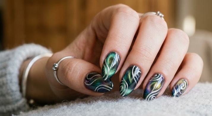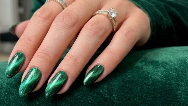 Rich emerald tones combined with chrome create a jewel-like shine. The magnetic effect adds depth, making the nails look like polished gemstones. Perfect for festive seasons or statement looks.