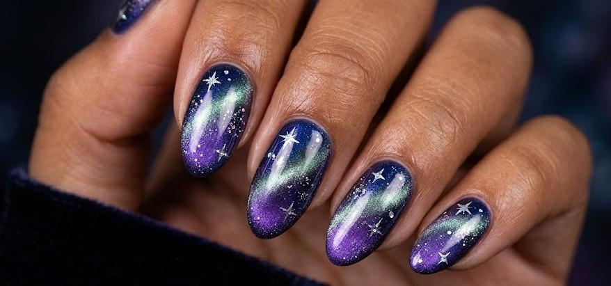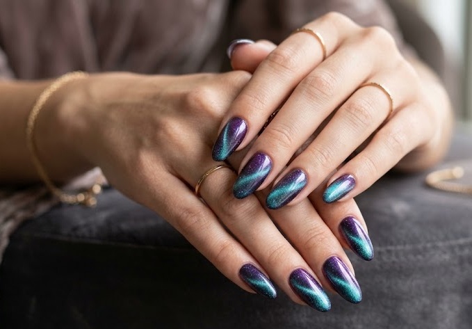 Inspired by outer space, this design blends deep blues, purples, and holographic chrome accents. The magnetic shimmer creates a galaxy-like beam, while tiny stars or glitter elevate the cosmic vibe.