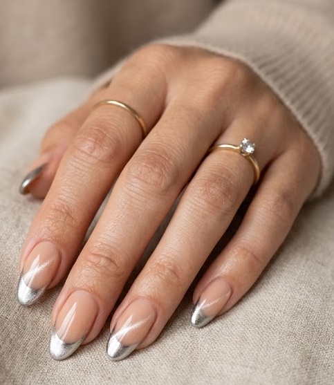 This design gives a molten metal effect that looks like liquid silver flowing across your nails. A dark base (usually black) enhances the sharp magnetic line, while chrome powder adds a reflective mirror finish. The result is bold, futuristic, and perfect for night events or parties.