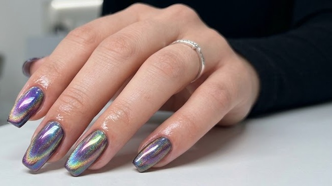 Holographic Rainbow Cat Eye Chrome Nails