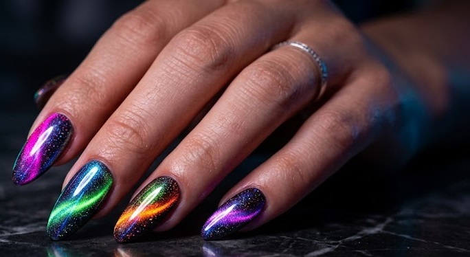 This bold design combines neon shades with chrome and magnetic effects. The bright colors glow intensely, while the cat-eye shimmer adds dimension. It’s playful, edgy, and perfect for summer or party vibes.