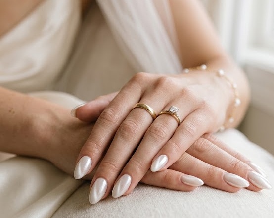 This delicate design features a milky white base with subtle chrome and cat-eye shimmer, creating a pearl like glow. It’s soft, clean, and perfect for bridal or minimalist aesthetics.