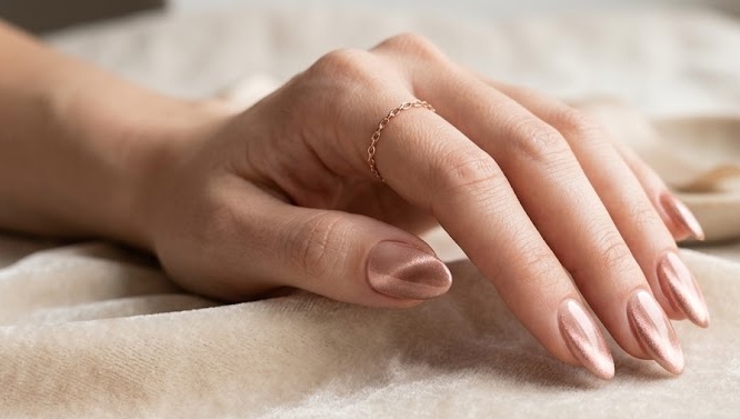 A soft and sophisticated design, this style combines rose gold chrome with a velvet cat eye glow. The shimmer diffuses gently instead of forming a sharp line, giving a smooth, luxurious finish. Ideal for weddings, office looks, or minimalist aesthetics.