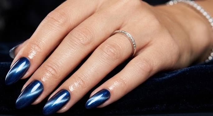 This design showcases a deep sapphire blue base infused with chrome shimmer, creating a luxurious gemstone like finish. The magnetic effect forms a glowing streak across the nail, resembling light reflecting through a precious stone.