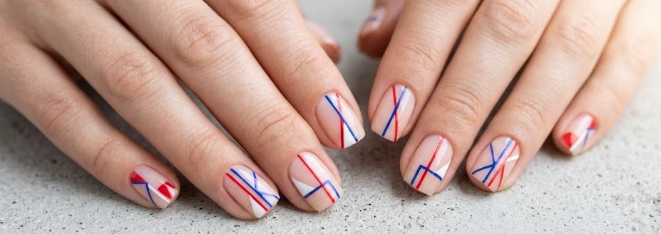 Abstract line art nails offer a contemporary and artistic interpretation of patriotic themes. This design uses free-flowing or geometric lines in red, blue, and white over neutral or clear bases. The lines can be thin and delicate or bold and graphic, depending on your style. It’s perfect for those who enjoy modern, minimalist nail art. Each nail can feature a different pattern, making the overall look unique and creative.