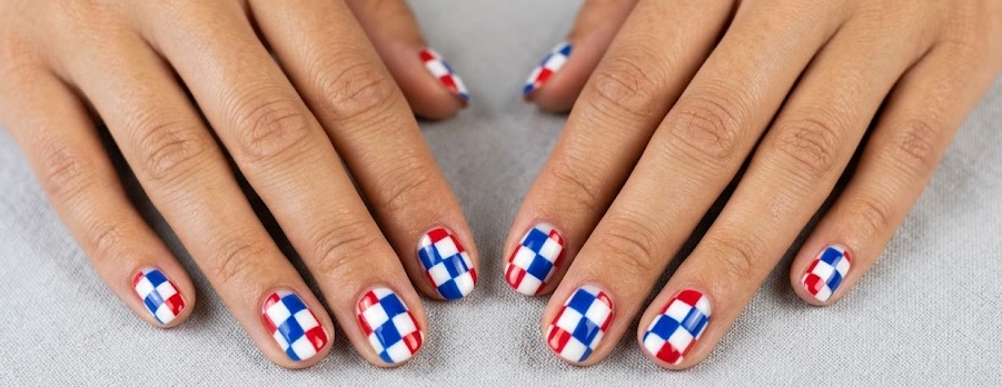 Checkerboard patriotic nails bring a bold and retro-inspired twist to traditional designs. This style features alternating squares in red, white, and blue, creating a striking pattern. The geometric layout adds a modern and edgy feel to the manicure. You can use this pattern on all nails or combine it with solid colors for balance. Precision is important to achieve clean, even squares.
