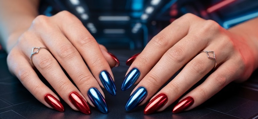 Chrome patriotic nails bring a futuristic and high-fashion twist to traditional Memorial Day designs. Featuring metallic finishes in red, blue, or silver, these nails reflect light beautifully and create a mirror-like effect. The smooth, polished surface gives a luxurious and edgy vibe that stands out instantly. You can choose to coat all nails in chrome or use it as an accent combined with matte or glossy colors.