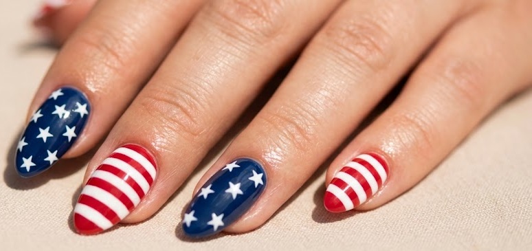 You can mix floral patterns with subtle stripes or dots for added detail. This design feels fresh, summery and elegant. It’s ideal for those who want a softer take on traditional patriotic nail art.
