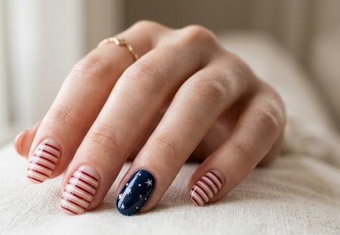 This design offers a sophisticated take on patriotic nail art by focusing on minimalism and precision. Instead of bold blocks of color, it uses thin, delicate stripes and tiny star accents to create a refined look. A neutral or sheer pink base allows the details to stand out without overwhelming the design. The stars can be hand-painted or applied as decals for a neat finish.