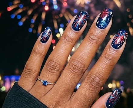 Firework-inspired nails capture the excitement and celebration of Memorial Day festivities. This design uses fine lines and glitter to mimic the look of fireworks bursting in the sky. A dark base like navy or black helps the colors pop dramatically. Red, blue, and silver glitter are often used to create the sparkling effect.