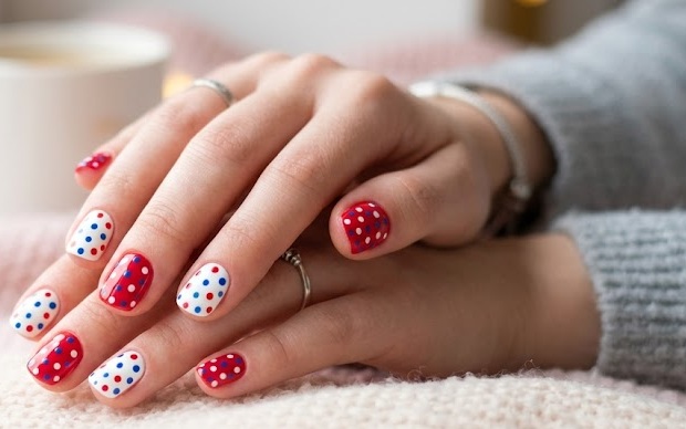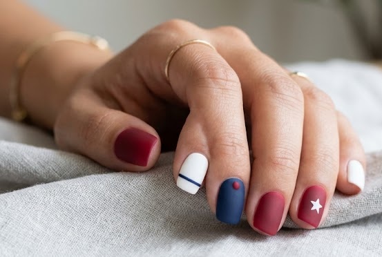 If you love eye-catching nail art, this bold design is perfect for making a statement. It combines vibrant shades of red, white, and blue in creative patterns such as diagonal stripes, color blocking, and star overlays. Each nail can feature a different design, adding a playful and dynamic touch. The use of high-gloss polish enhances the brightness and makes the colors pop even more.